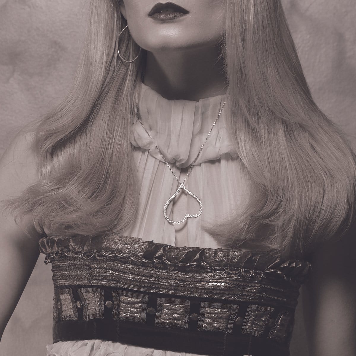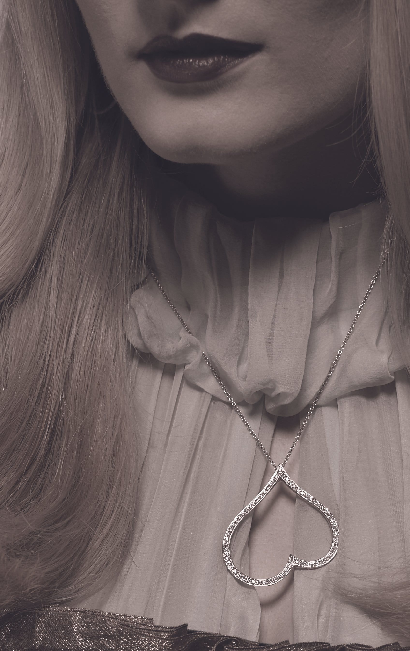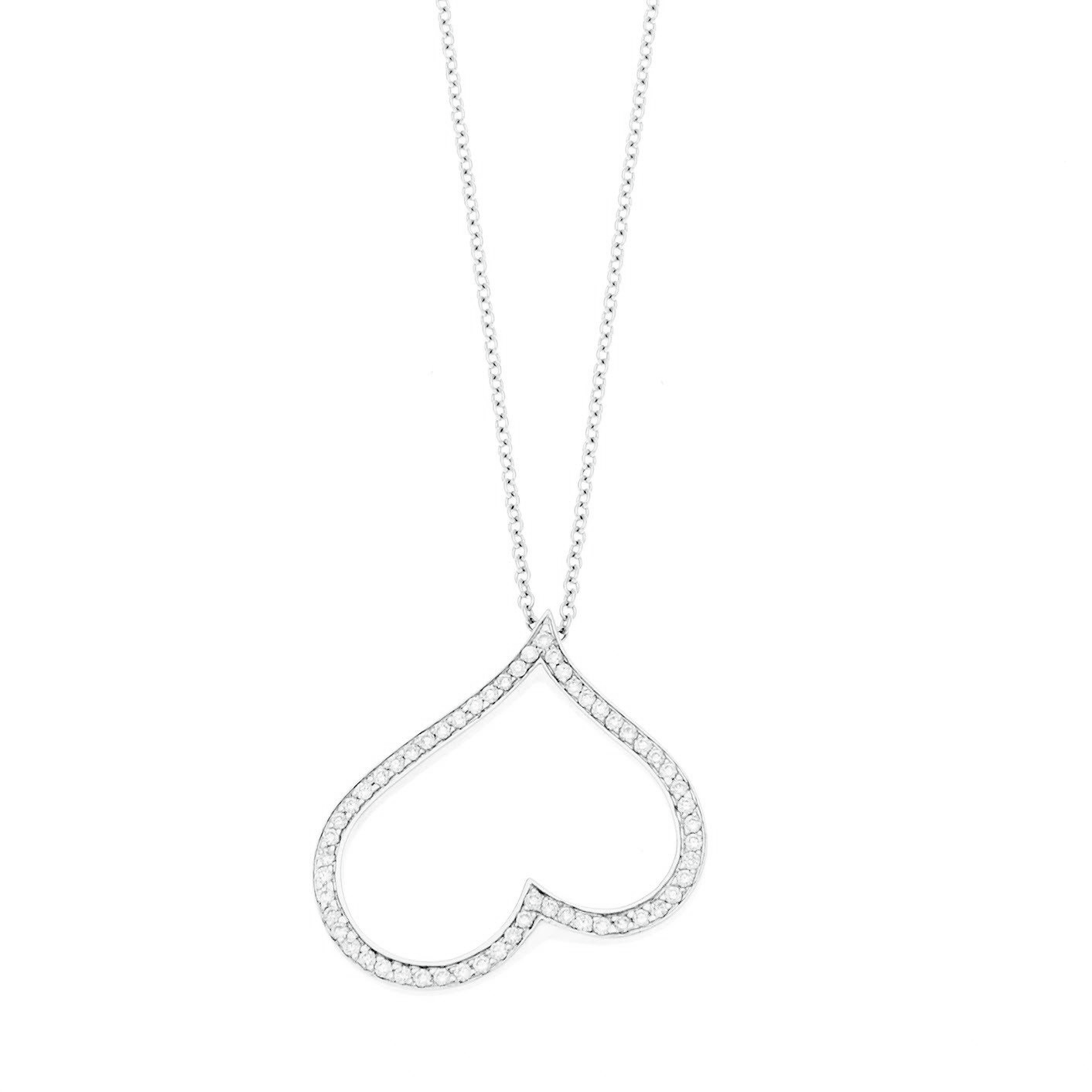 Open Heart Aire Heart Necklace is fashioned in 18k white gold and encrusted with eighty-three VS clarity D-F colorless ideal cut round brilliants diamonds. This fabulous necklace may be worn both ways, as shown.