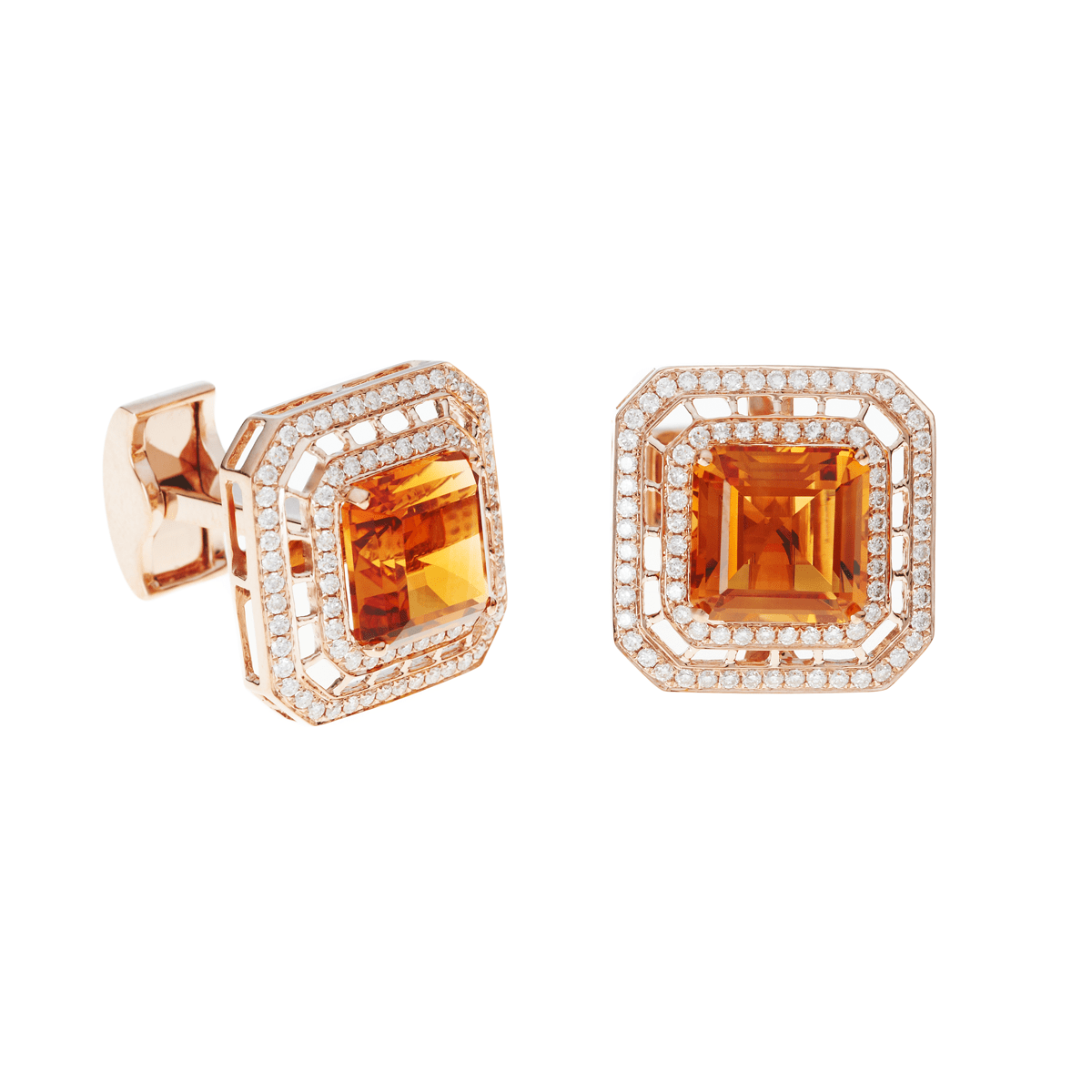 Aire Gold pair of Cufflinks - "Cognac" is created in 18K amber hue gold adorned with round brilliant VS clarity D-F colorless diamonds of excellent cut highlighting a square radiant cut citrine gemstone from our signature Red Gold collection.
