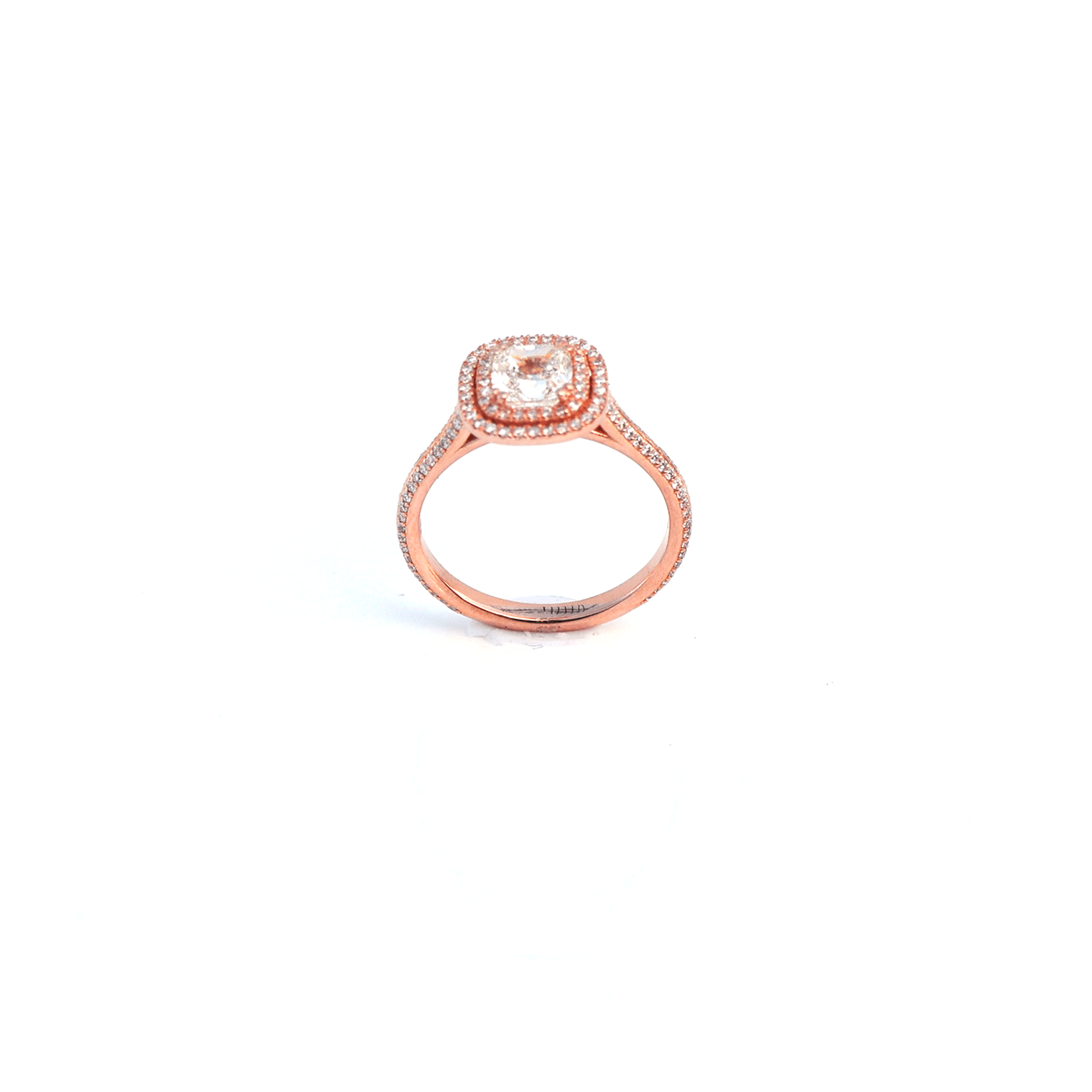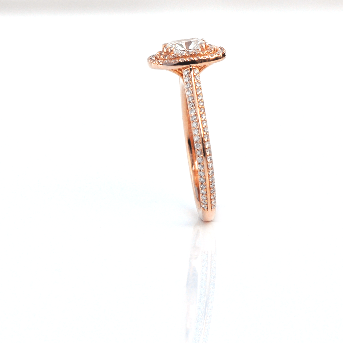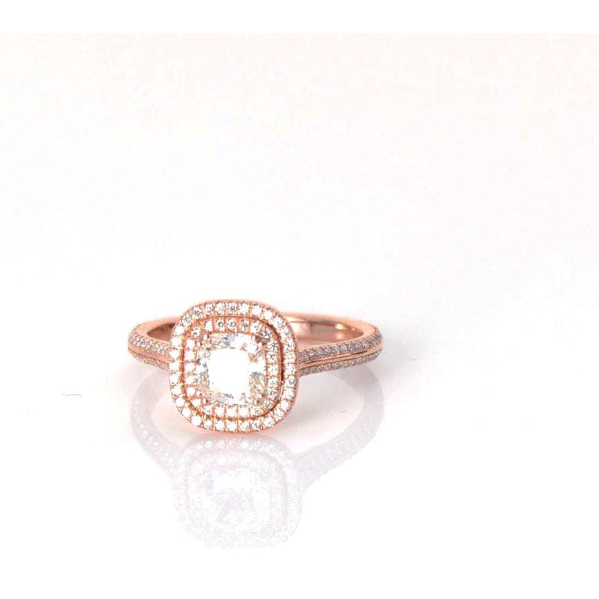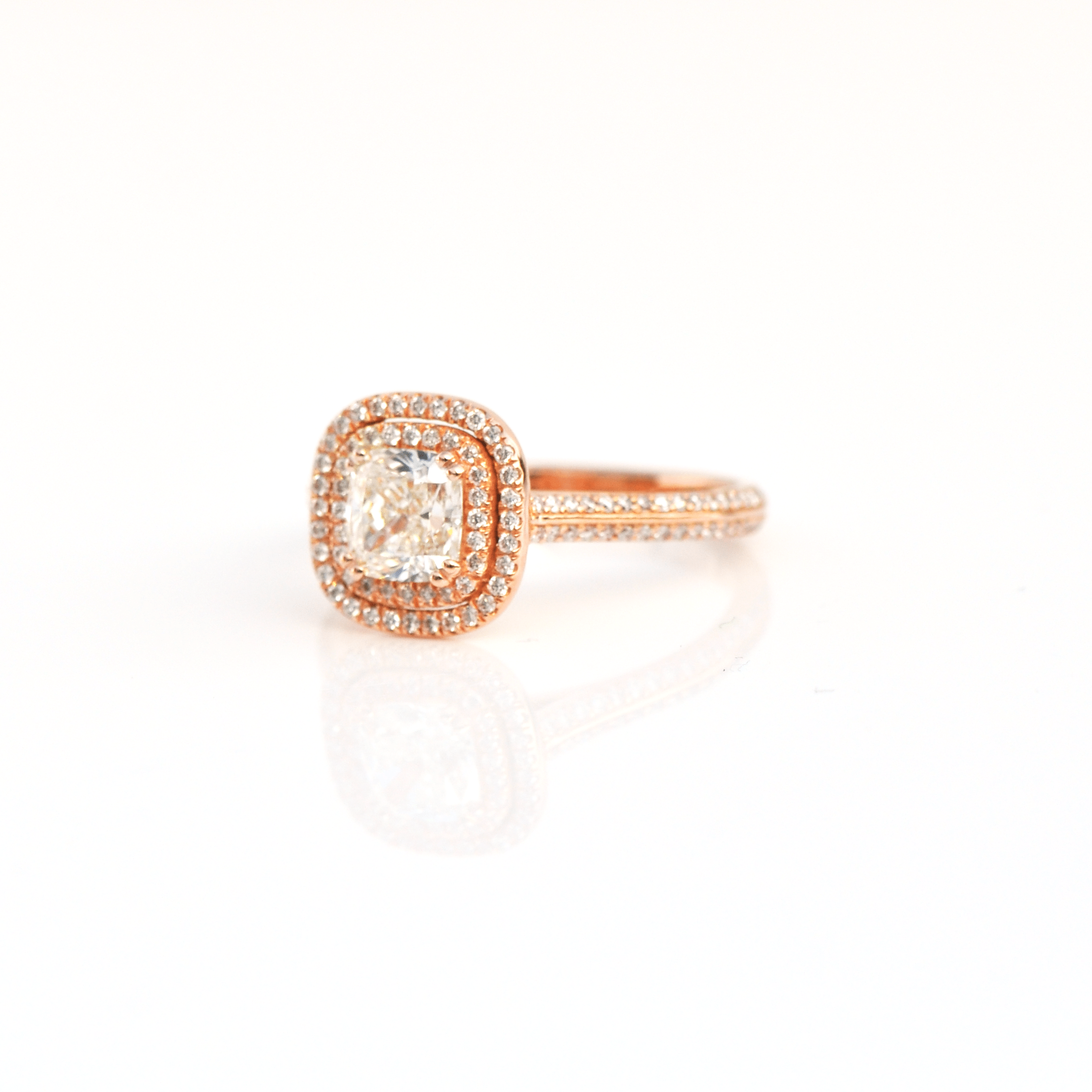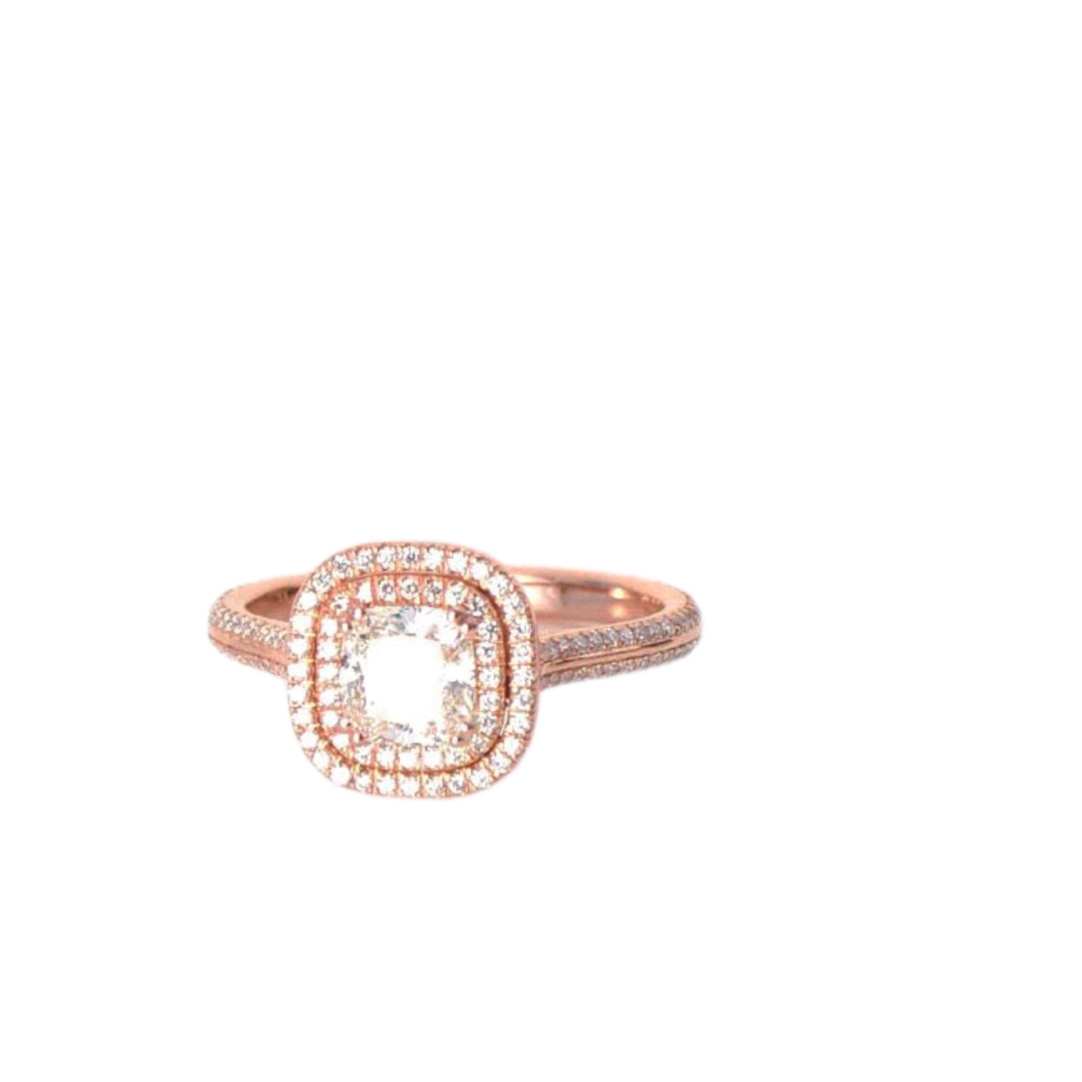 Soulmate Engagement Ring is irresistibly beautiful. It is handmade in 18 karat amber hue gold and adorned with ideal cut round brilliants highlighting 1.00 carats center cushion modified brilliant GIA certified diamond. This ring is sure to capture her heart and win the admiration of friends.