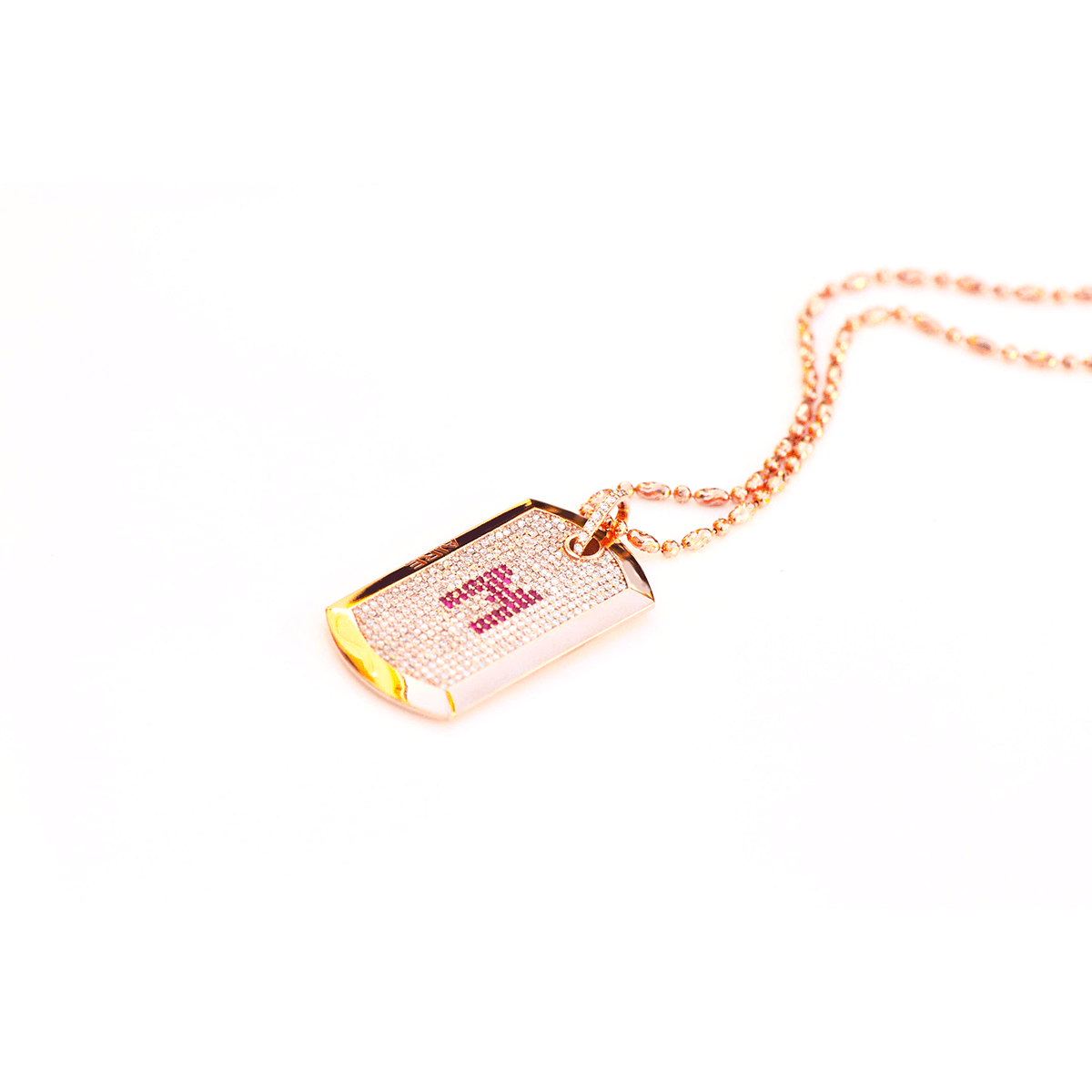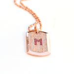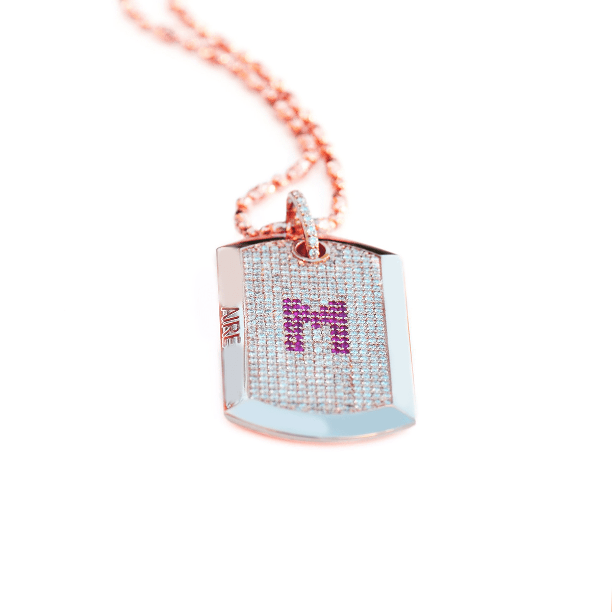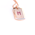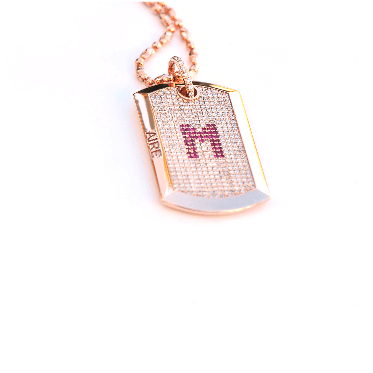 Aire Full Pavé Diamond Dog Tag - Handmade in 18-karat amber hue gold with initial set in rubies from our Signature Red Gold ® Collection. The "M" initial is changeable to any other alphabet of your choice and the back is customizable with up to 10 characters of text.