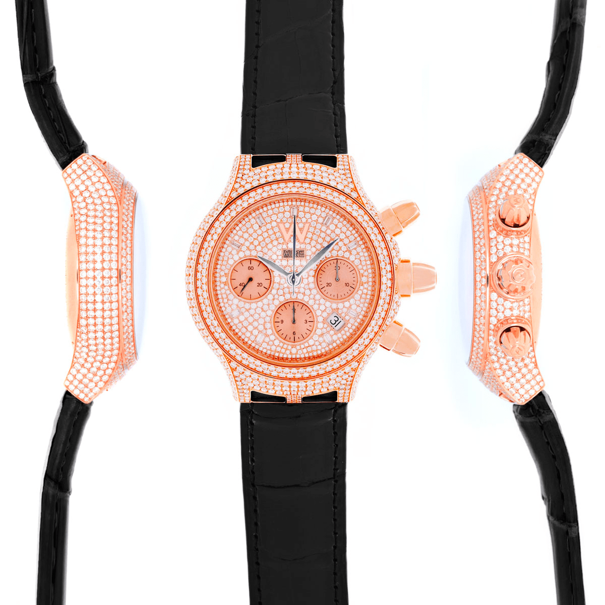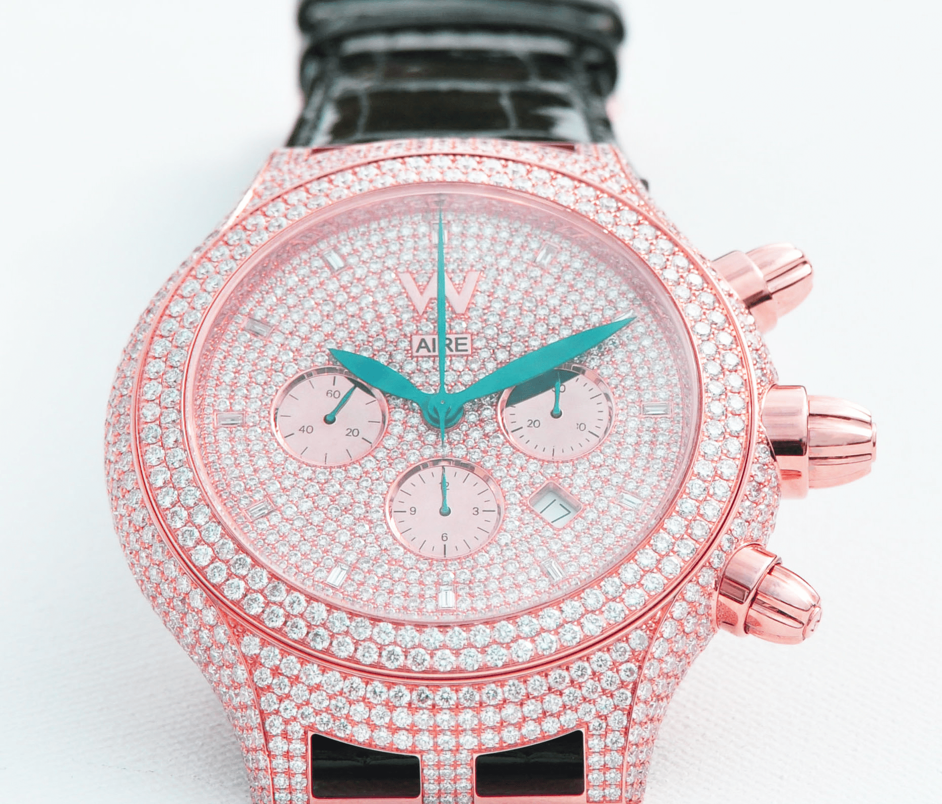 Aire Parlay Automatic Chronograph full diamond watch is stunning! Designed in the spirit of continuing to push the boundaries in mechanics and designs, it is the epitome of beauty and brains.
