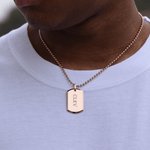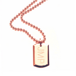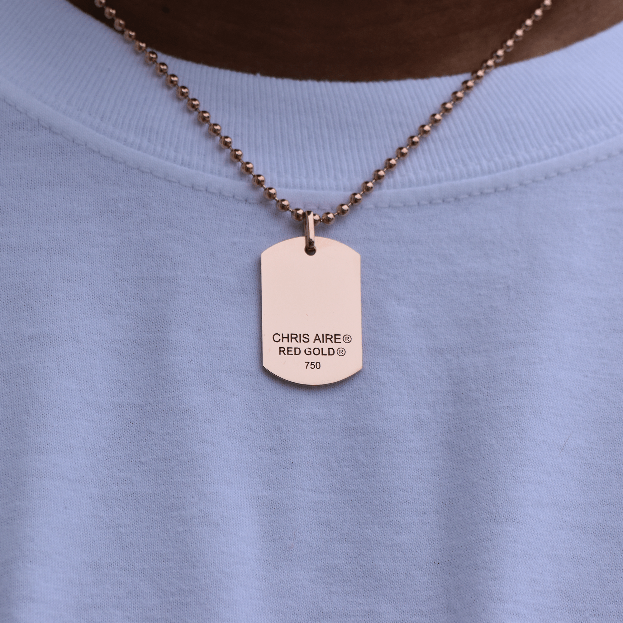 Chris Aire medium dog tag is hand made in18-karat amber hue gold featuring an 18" beaded chain, from our Signature Red Gold® Collection. May be personalized with name, initials,  or messageup to 10 characters.