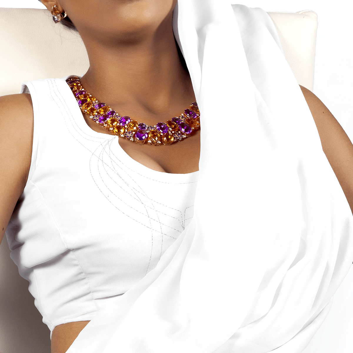Our Hollywood Royalty Necklace is created in 18 Karat Amber Hue Gold, featuring 311 carats of ideal cut premium quality Diamonds, Citrine, Amethyst and Iolite gemstones that are meticulously cut and set in a gorgeous array from our Signature Red Gold® Collection. This magnificent creation encapsulates all that is beautiful and uniquely Chris Aire. It is the ideal self-purchase or a perfect gift.