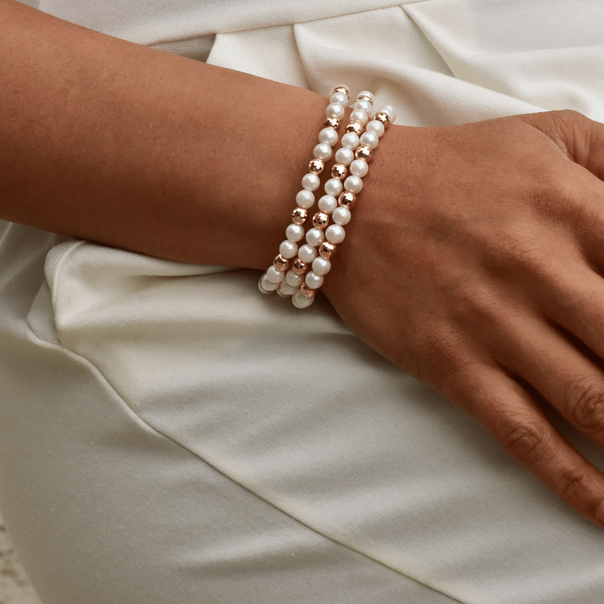 Aire Gold and Pearl Bead Bracelets are made with Akoya Pearls and 18-karat amber hue diamond cut gold beads from our Signature RED GOLD® Collection.