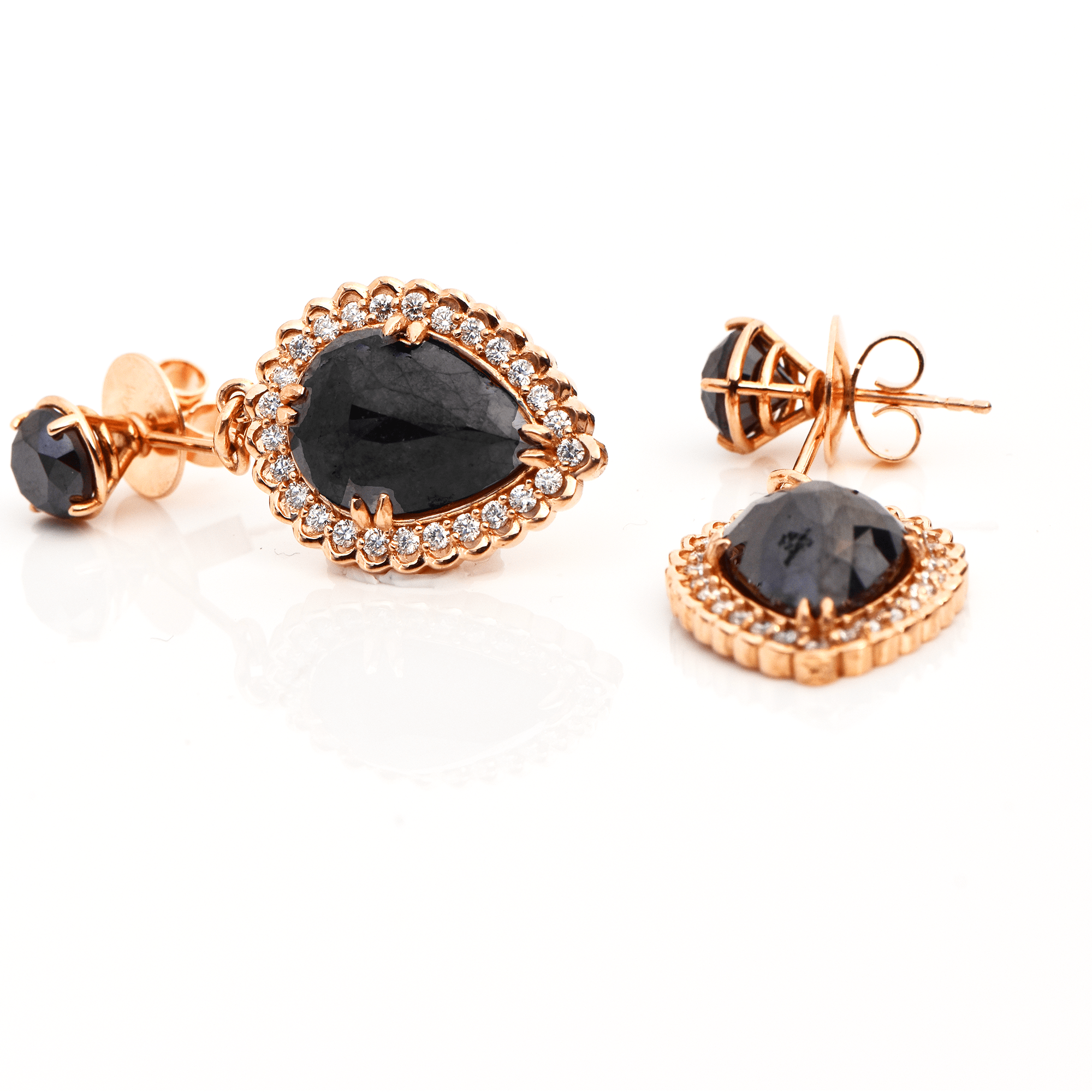 Everlasting Favor Earrings. They are created in 18-karat amber hue gold. They feature two matched pairs of round brilliants and pear-shaped diamonds with a combined weight of 9.57 carats, accented by fifty-two round brilliants ideal cut VVS - VS clarity D-F colorless diamonds for a total diamond weight of 10.21 carats, from our Signature Red Gold ® Collection.