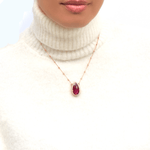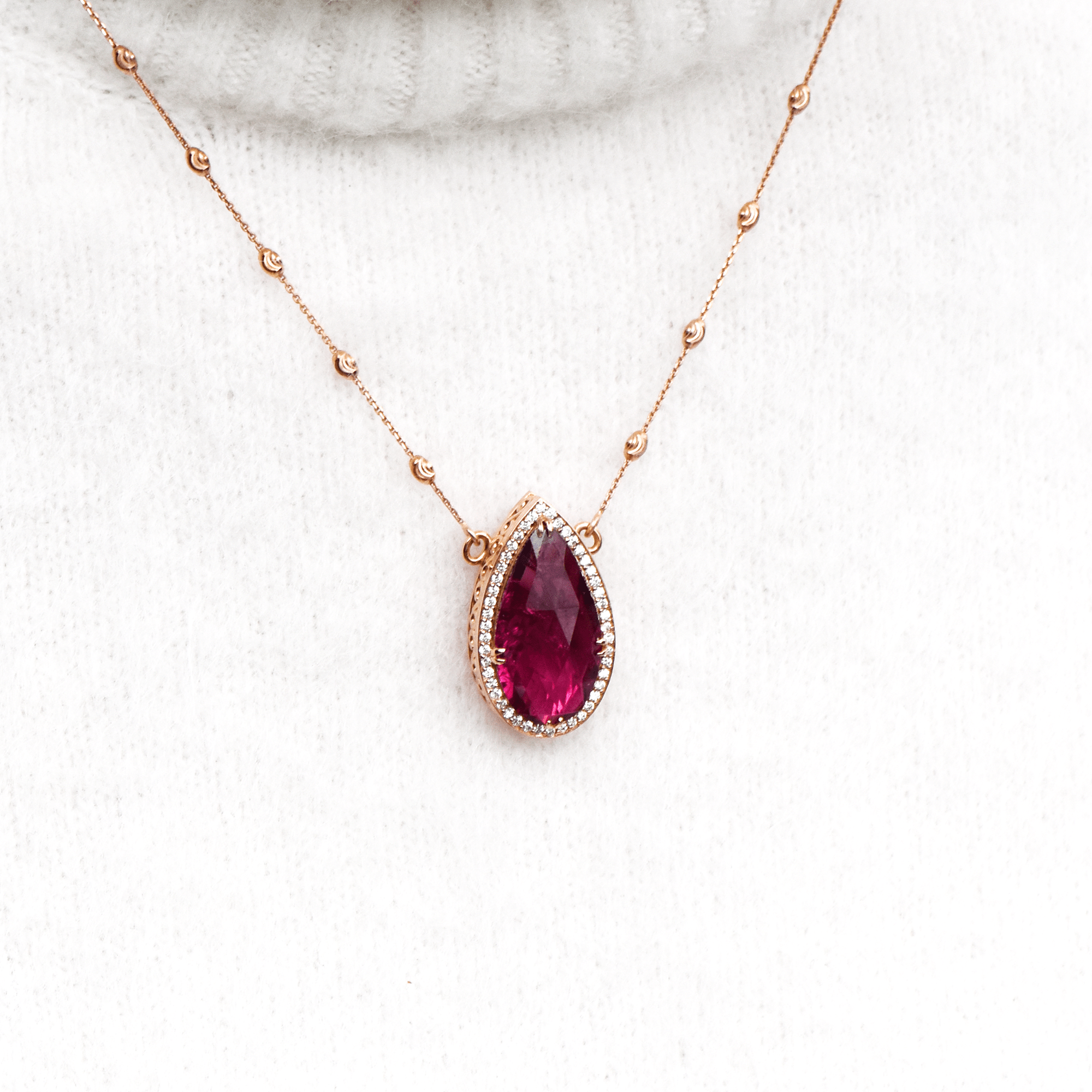 Fire & Passion Necklace. An oval pendant featuring 11.02 carats rich dazzling rubellite gemstone inverted and framed with forty-six micro-pave round brilliants VVs-Vs, D-F colorless ideal cut diamonds mounted on 18-karat amber hue gold detailed setting, and suspended on a 14-karat 18" diamond cut ball chain, from our Signature Red Gold® Collection.