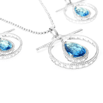 Genesis - Aire Blue Topaz Necklace and Earrings is alluring. Handmade in 18 karat white gold, highlighting three divine a pearl-shaped brilliant-cut blue topaz, and framed with two lines of micro-pave set round brilliant diamonds of VS clarity D-F colorless ideal cut diamonds. This unique set of necklace and earrings is a definite compliment magnet.