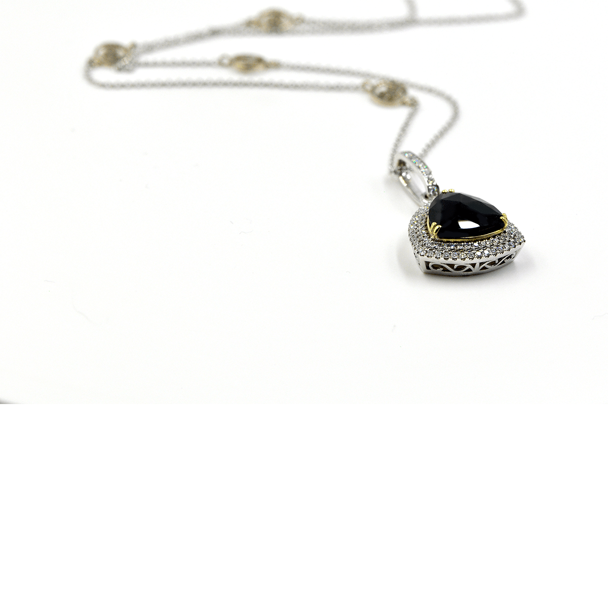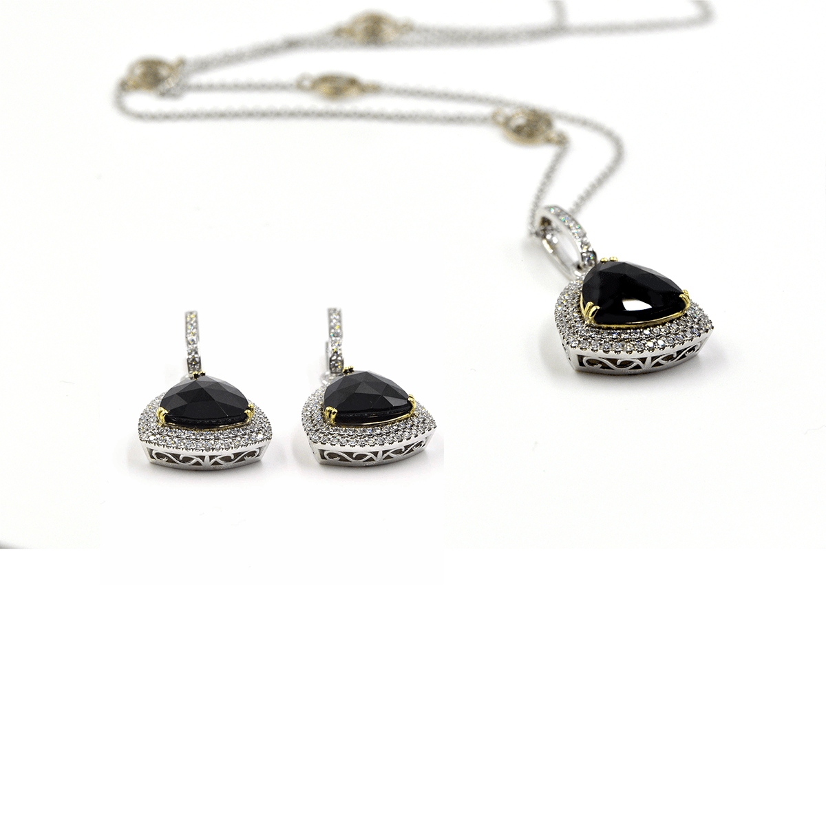 Mystere Earrings and Necklace Set. Created in 18-karat white and yellow gold featuring custom-cut faceted brilliant black onyx framed by two rows of round brilliants micro pave set diamonds.