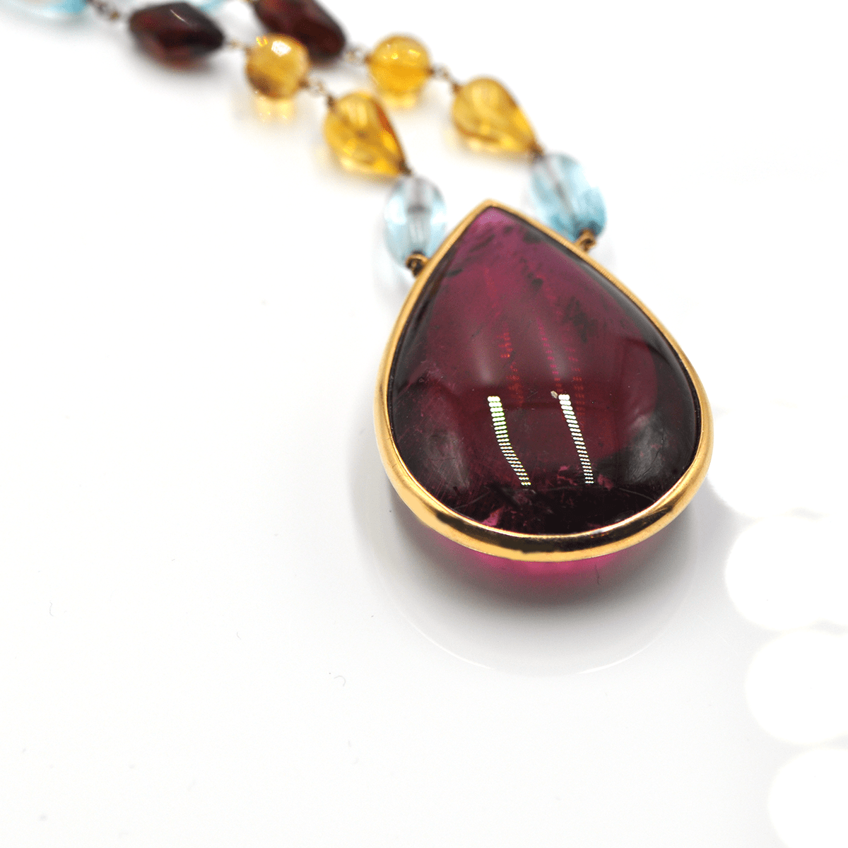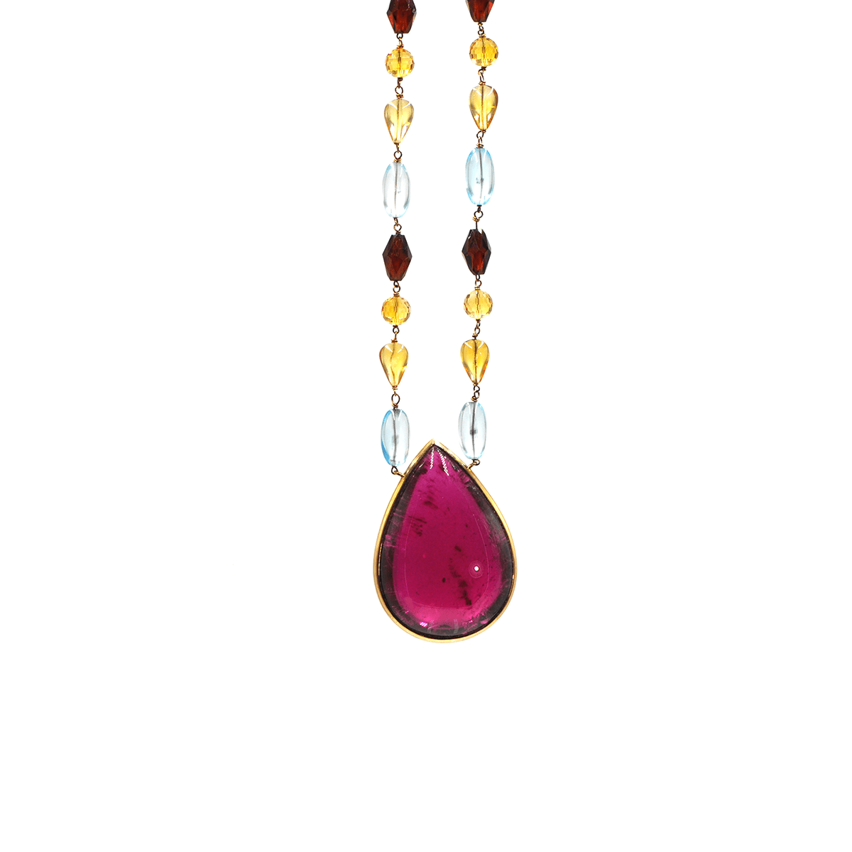 Endearing Passion Necklace. Made in 18 karat white gold, and an array of red tourmaline, aquamarine, and citrine colored gemstones strung unto a large pear-shaped red tourmaline pendant.