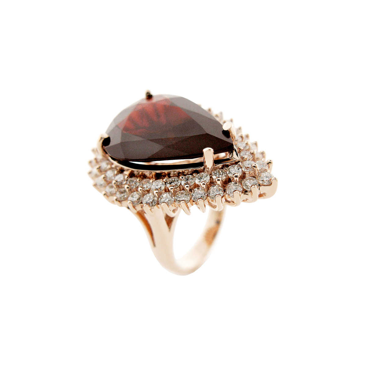 The Power Within Garnet & Diamond Ring is a statement piece. Bold and assertive, it is created in 18 karat amber hue gold and accentuated with VS clarity, D-F colorless ideal cut proud brilliants diamonds featuring a pear-shaped 16 carats garnet gemstone from our Signature Red Gold Collection.