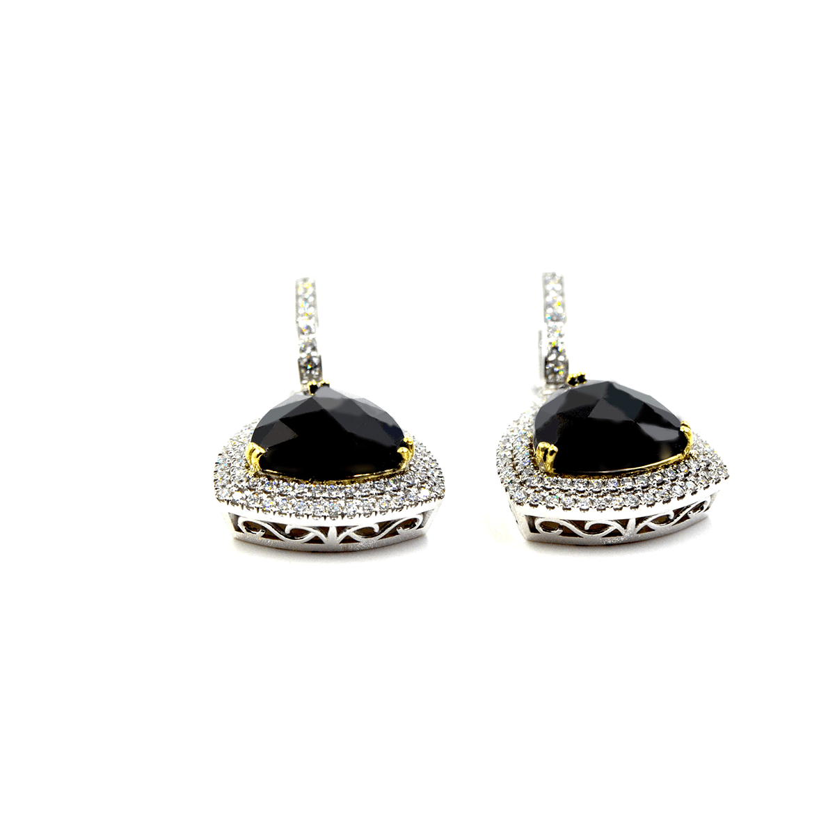 Mystere Earrings. Created in 18-karat white and yellow gold featuring custom-cut faceted brilliant black onyx framed by two rows of round brilliant micro pave set diamonds.