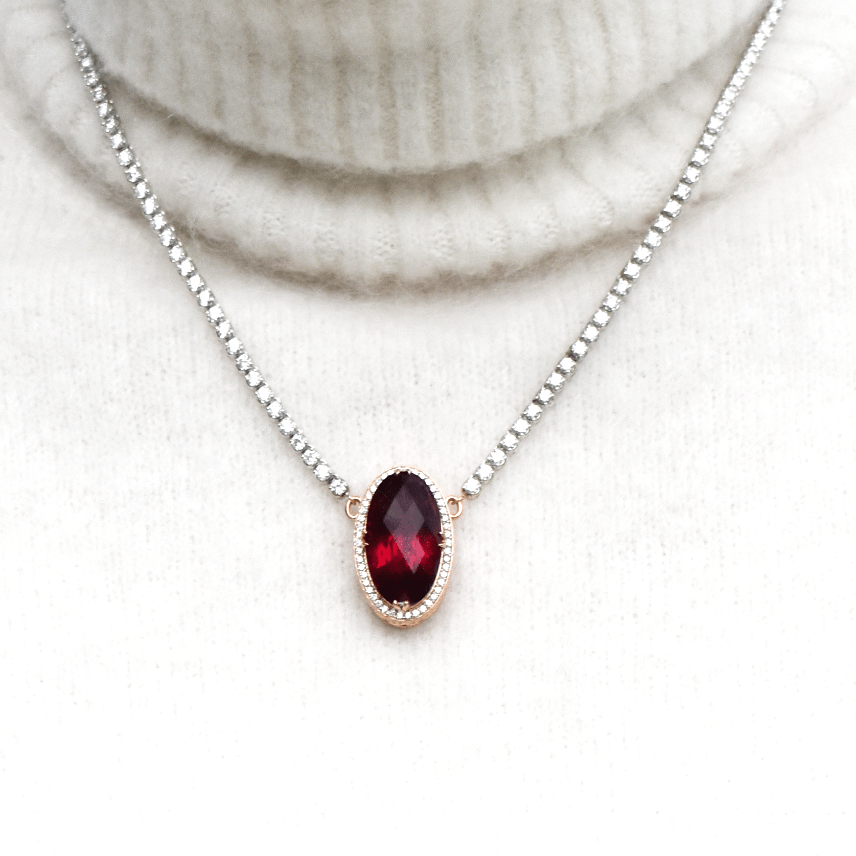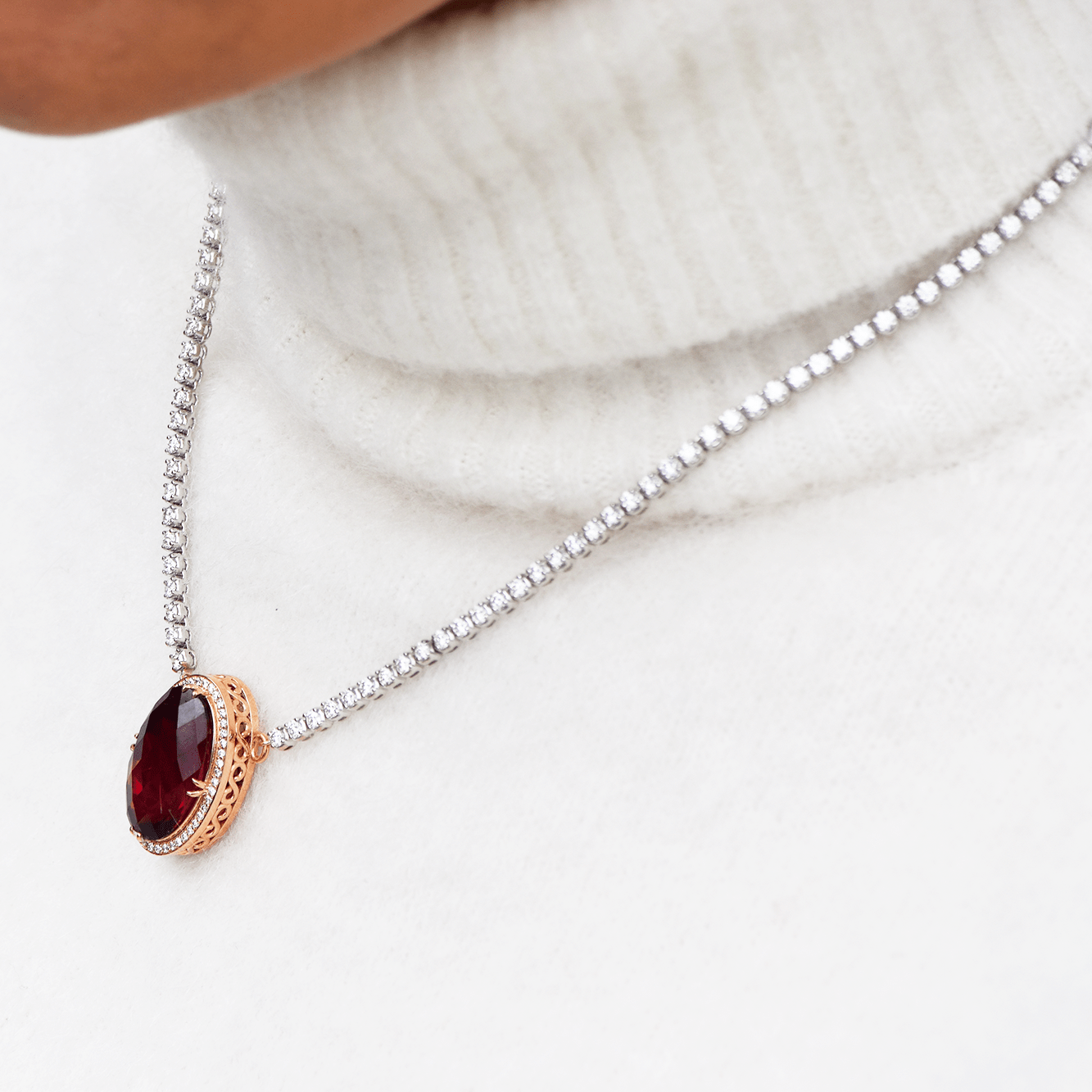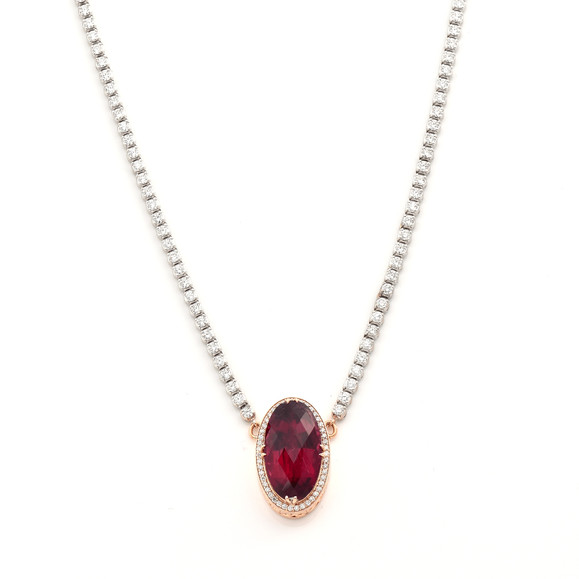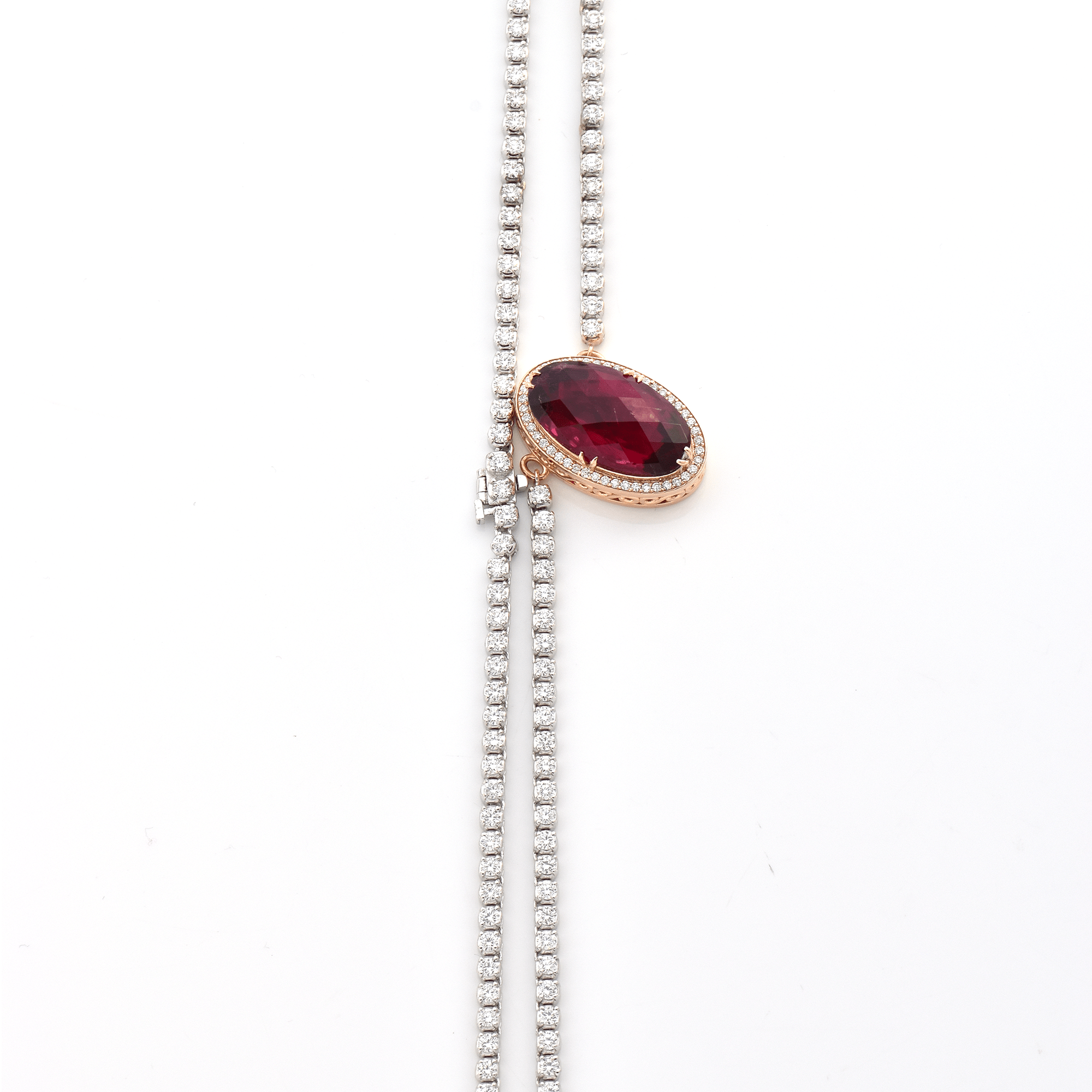 Power Necklace is a gorgeous combination of 18-karat white and amber hue gold bedecked in one hundred and seventy stunning 8.17 carats round brilliants diamonds of VVS-VS clarity, D-F colorless diamonds accenting an 18.17 carats stunning, opulent faceted oval rubellite gemstone from our Signature Red Gold® Collection.  It is the epitome of luxury.