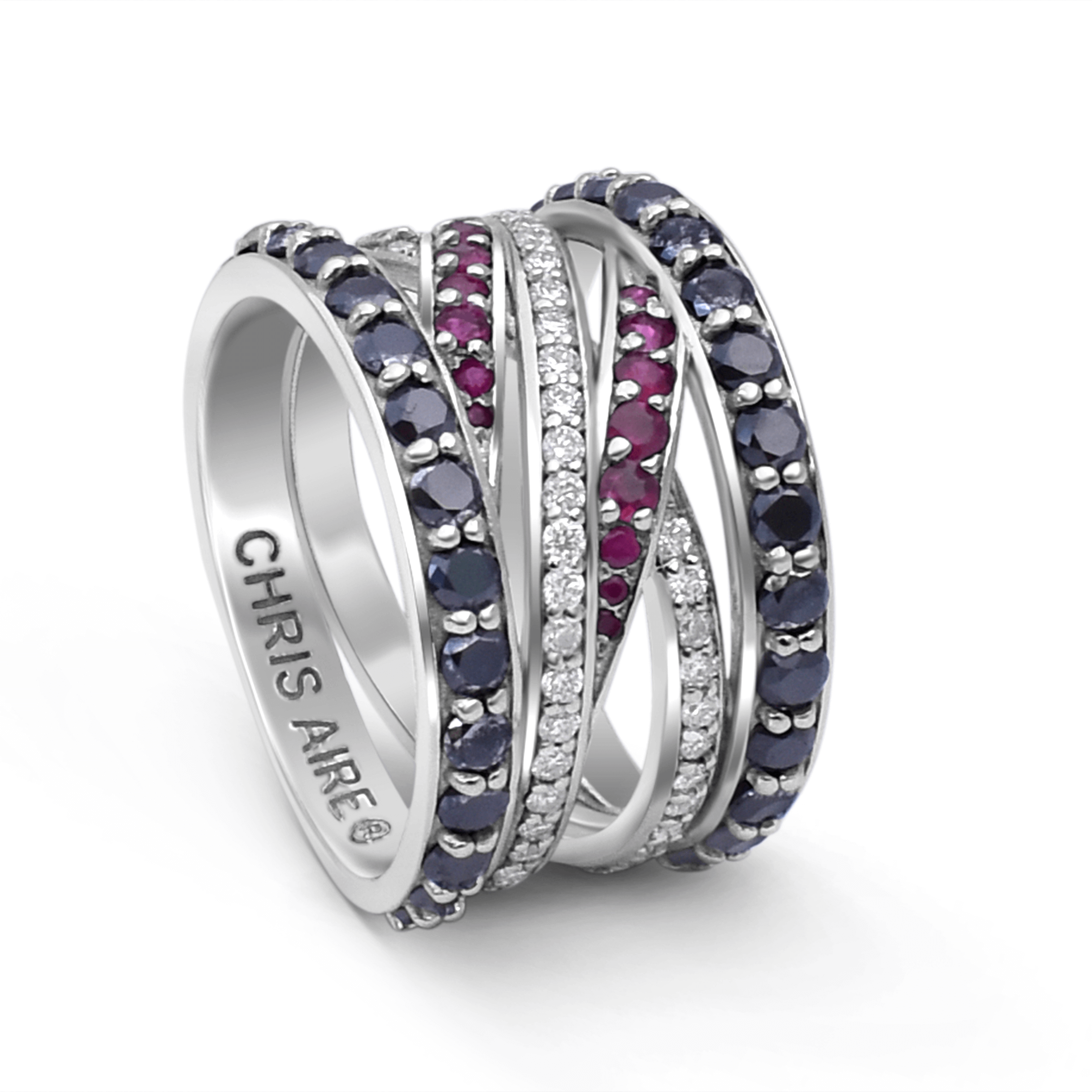Ring-18 Karat White Gold With Rubies, Black and White Diamonds For Women