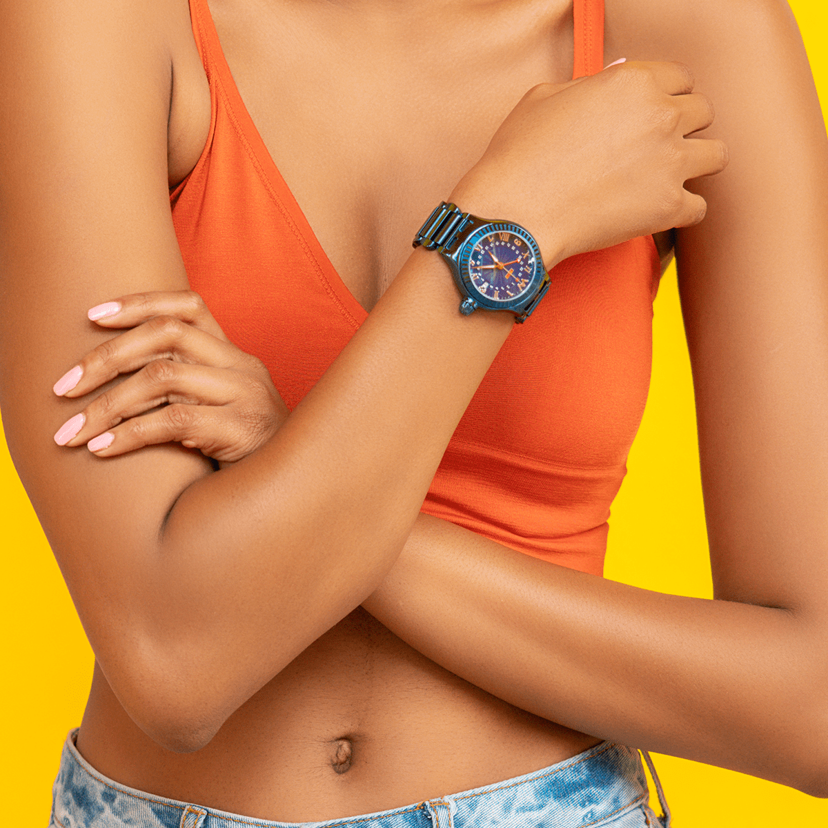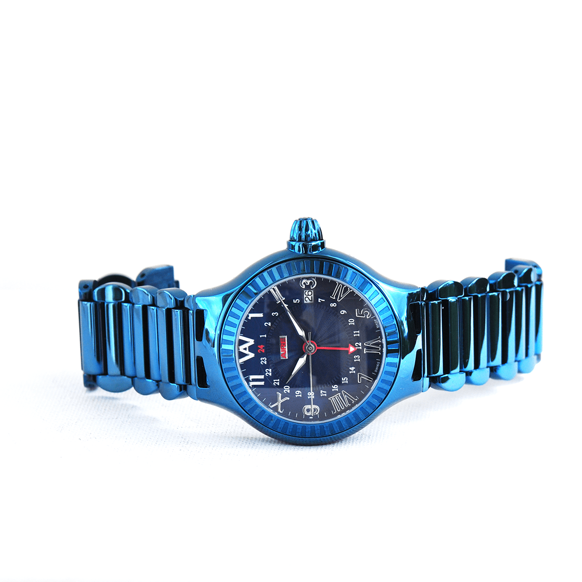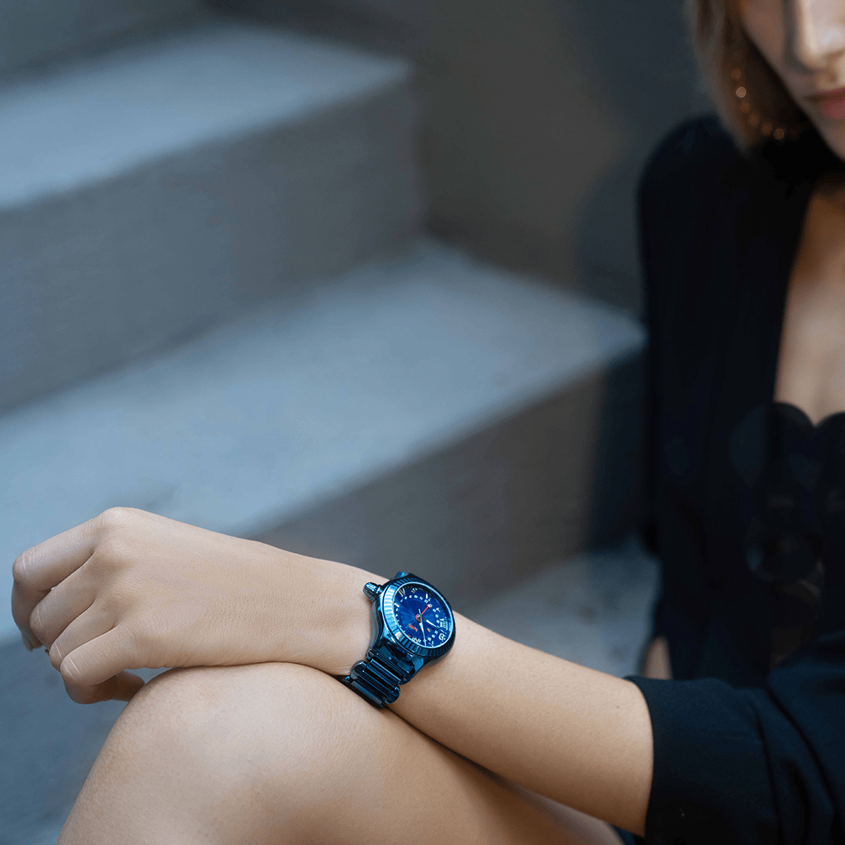 • 316L Diamond infused PVD blue stainless steel case & bracelet