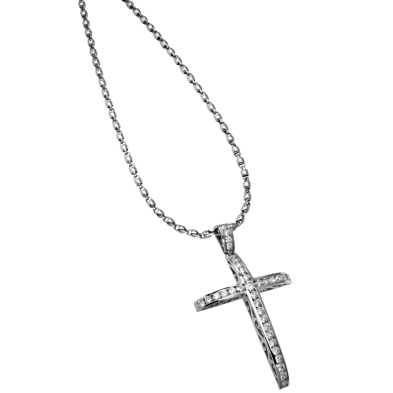 Redemption Cross is made in 18K white gold adorned with a line of channel set round brilliants diamonds of VS clarity D-F colorless ideal cut diamonds suspended on a 16" 18 karat white gold link chain. It is gorgeous.